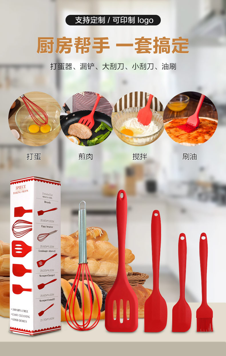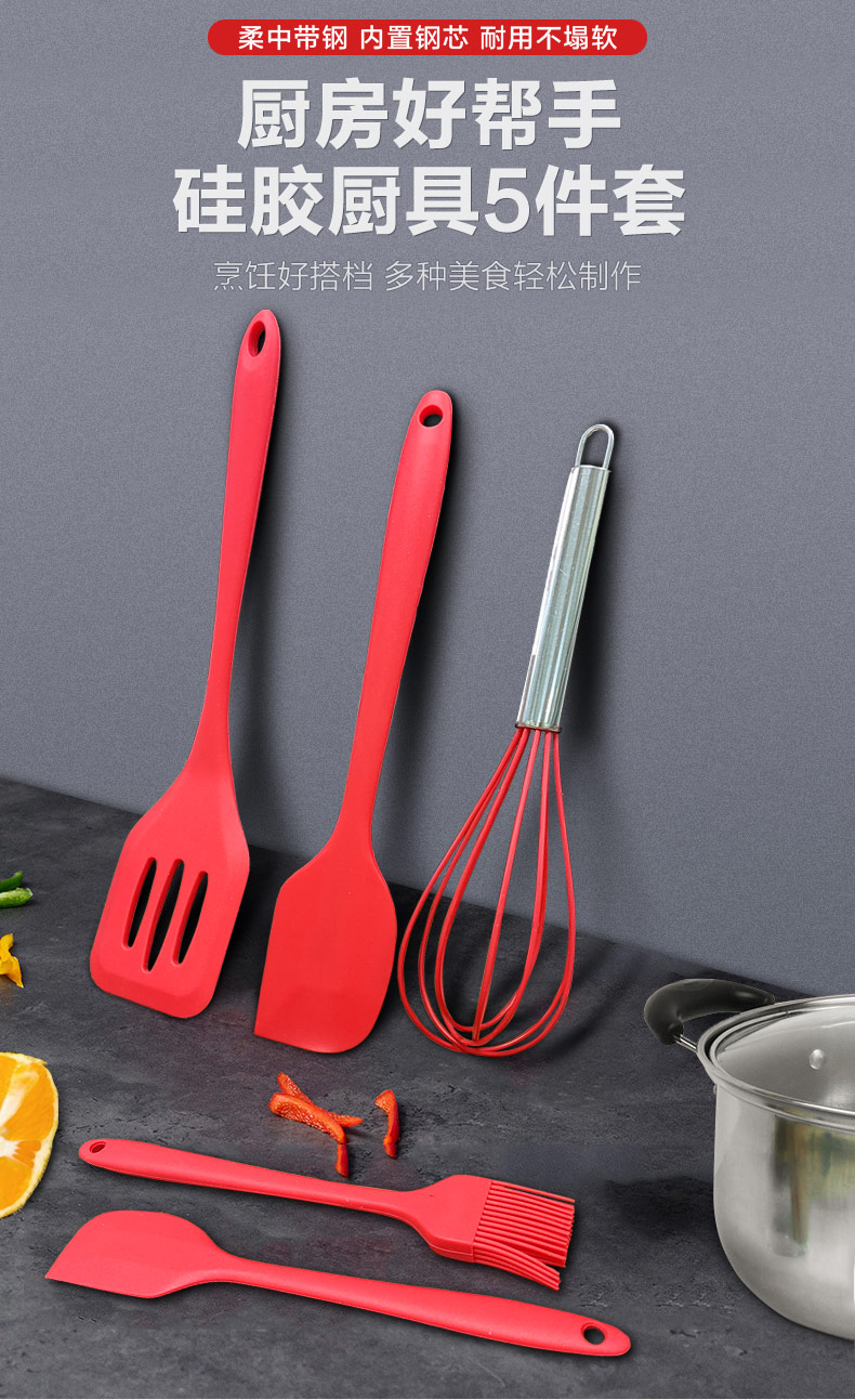 您的位置:首頁 > 產(chǎn)品中心 > 硅膠廚具用品 > 硅膠廚具5件套 廠家直銷 支持定制 可印LOGO