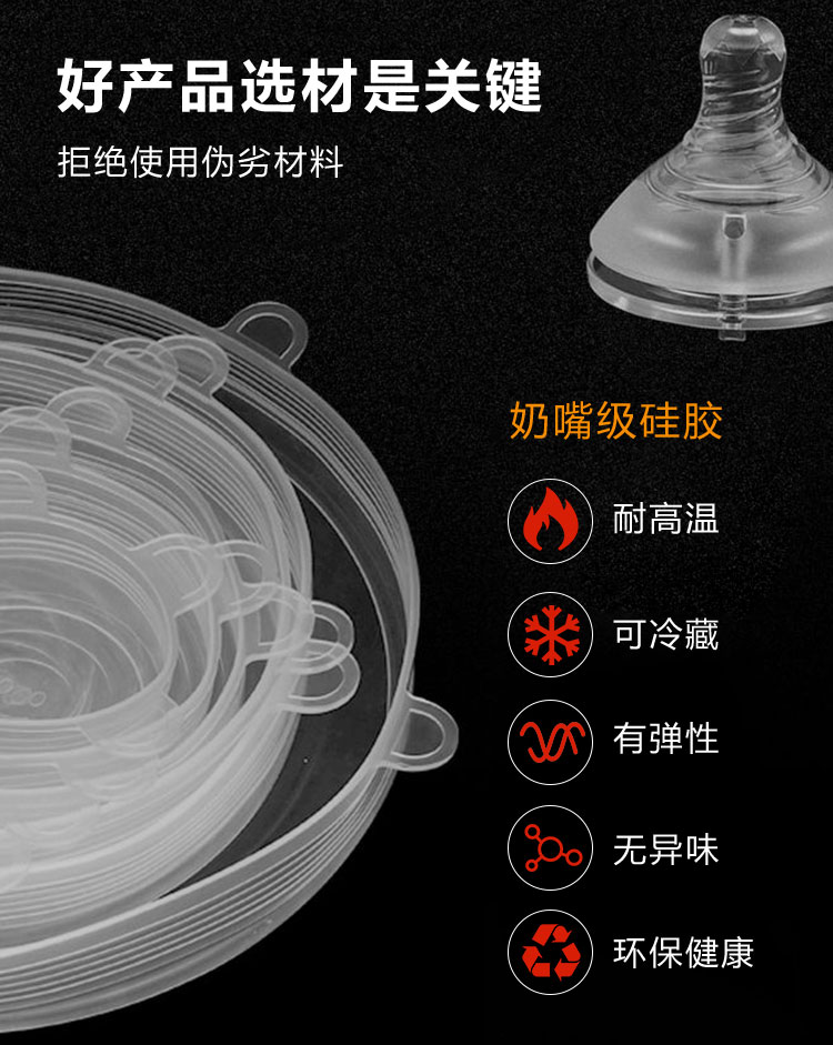 產品特點:適用于冰箱冷凍可做保鮮冷藏使用,可進洗碗機消毒柜,也可進烤箱、微波爐加熱制作食物。能使鍋碗密封,用于食品保鮮。配合不同大小鍋、碗、盆以及杯子等器皿使用。產品方便清洗,手感柔軟,顏色鮮艷,經久耐用,環(huán)保健康。